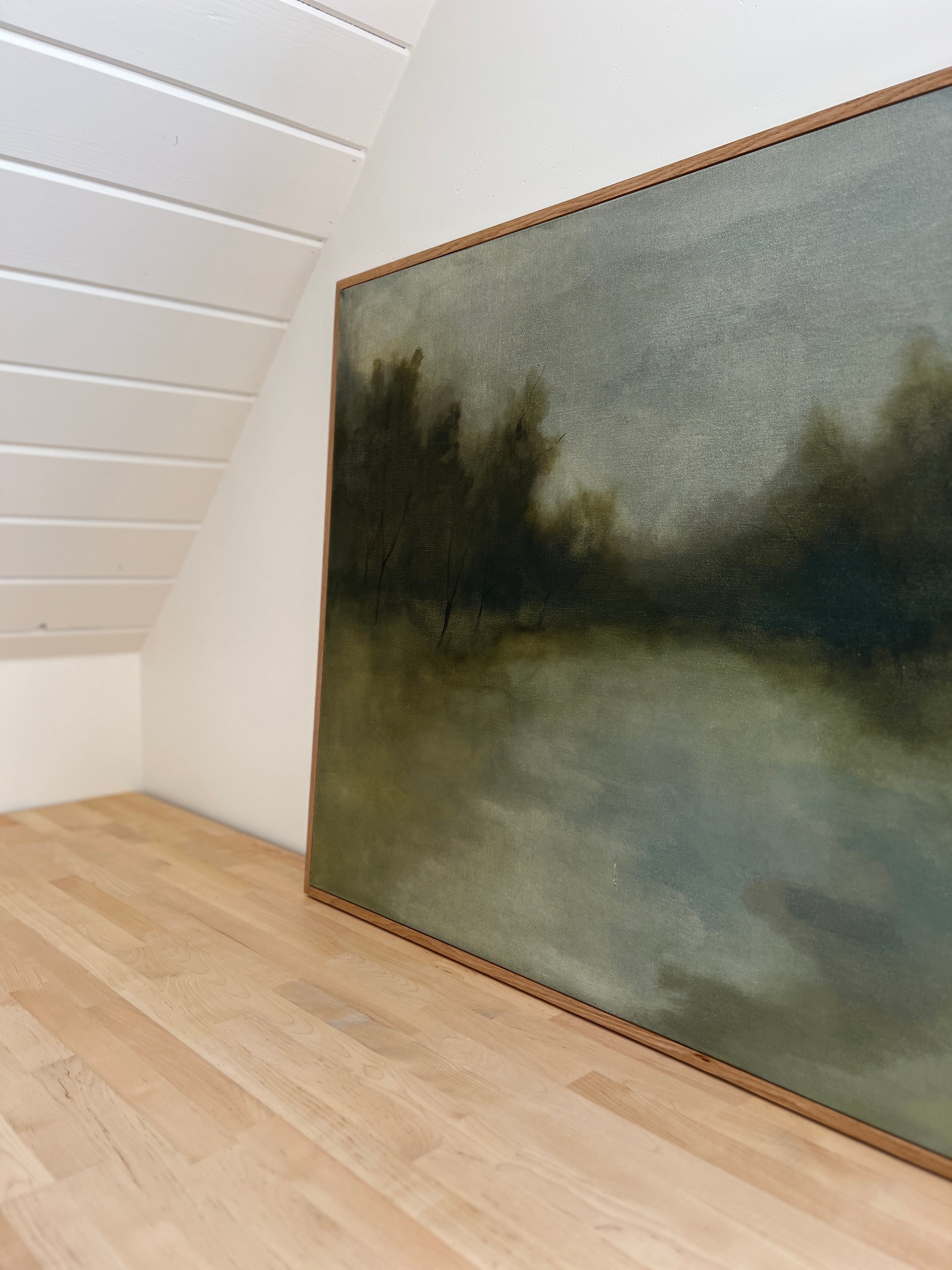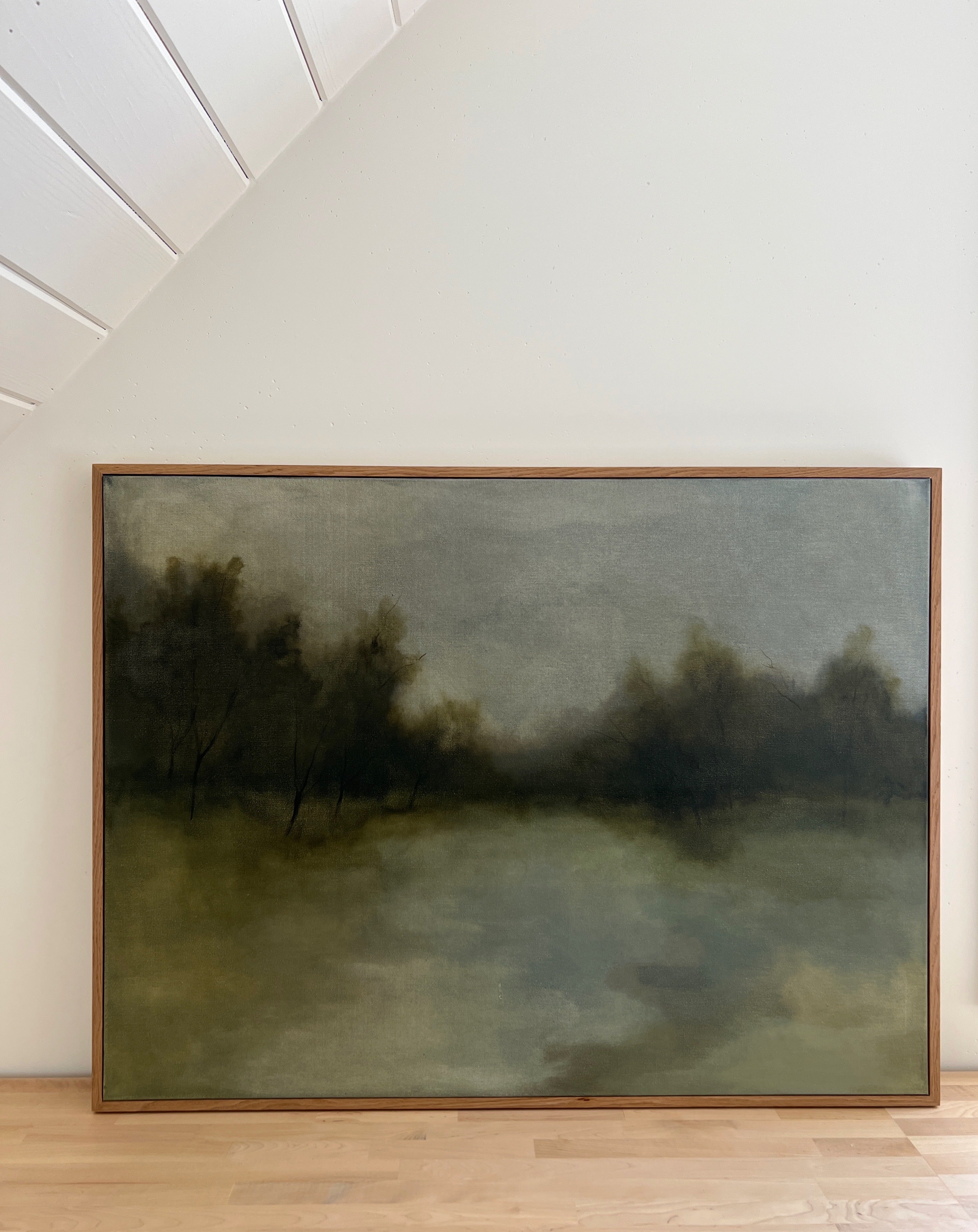 Acrylic original on stretched canvas framed in a custom white oak frame. Artists signature and title on the back. Your original arrives framed and ready to hang.