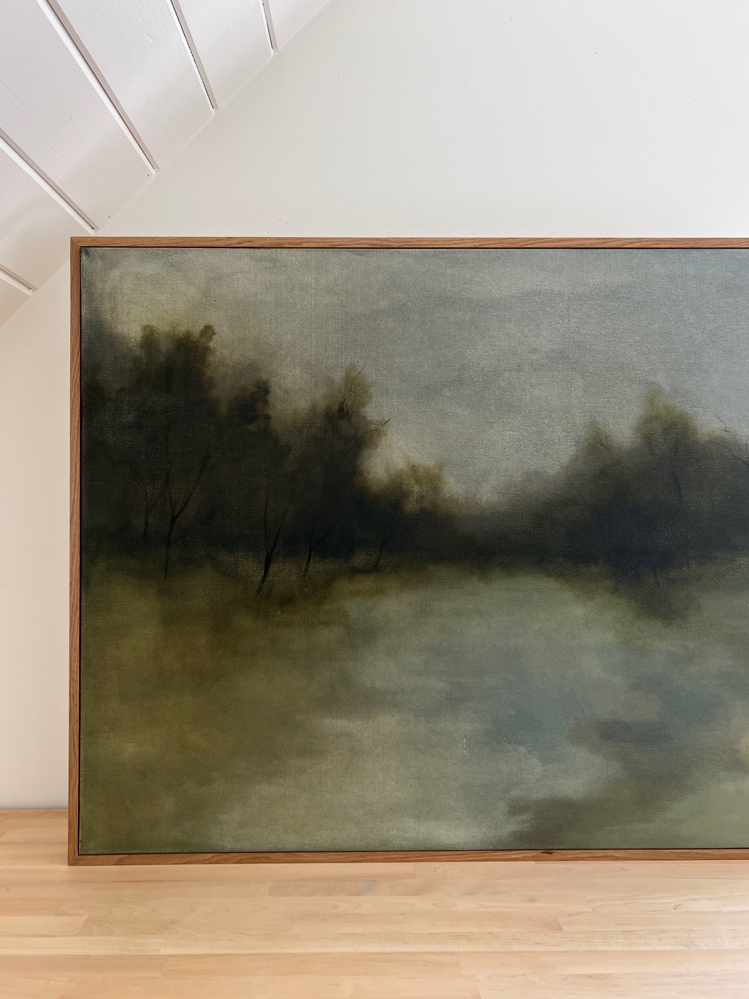 You will find a different moment every time you look at this peace filled original. Your eye is pulled into the tree line and directed to the calming water that fades into its surroundings. This layer upon layer of acrylic paint was used in order to maintain the texture of the canvas coming through the scene.