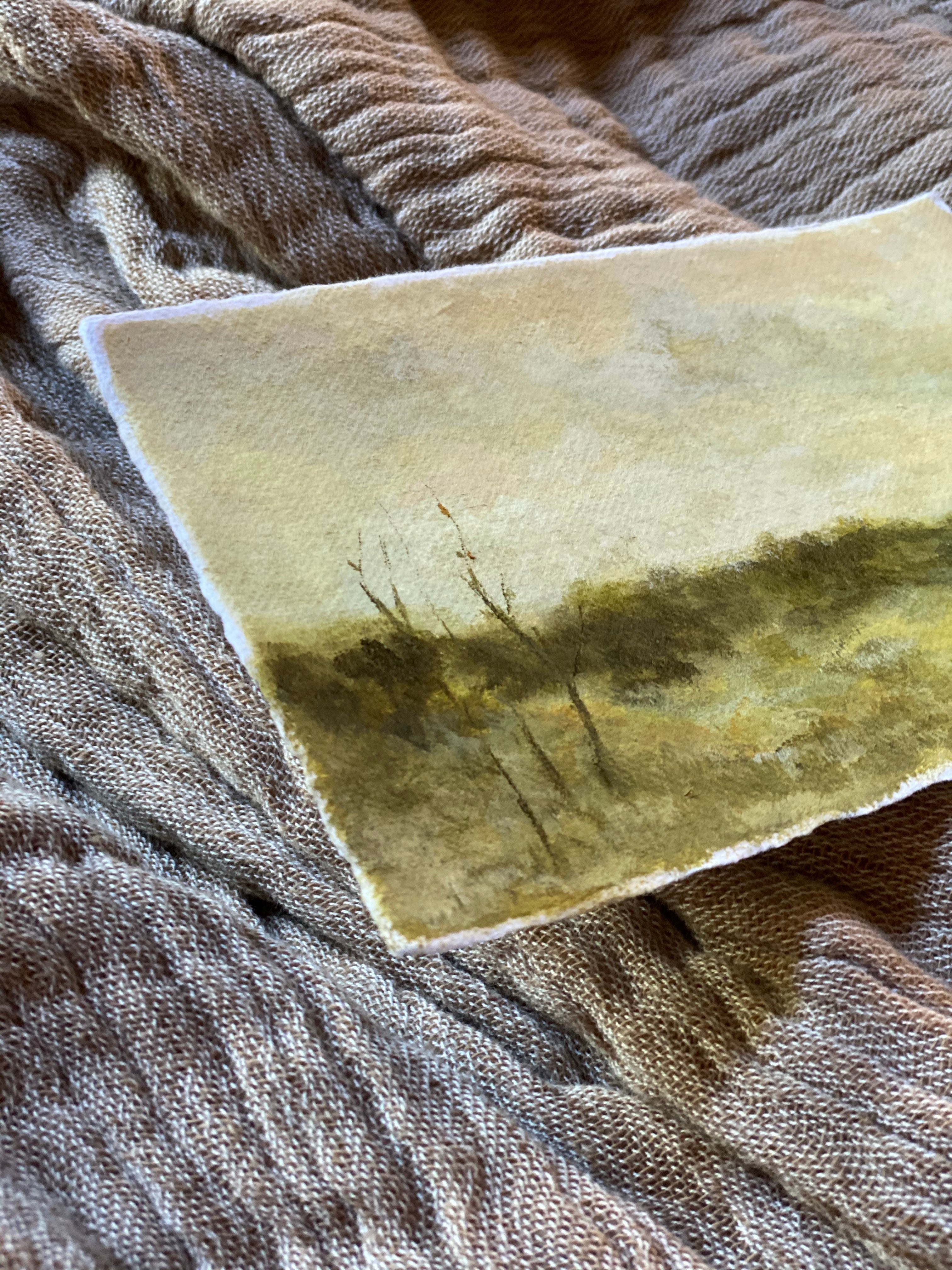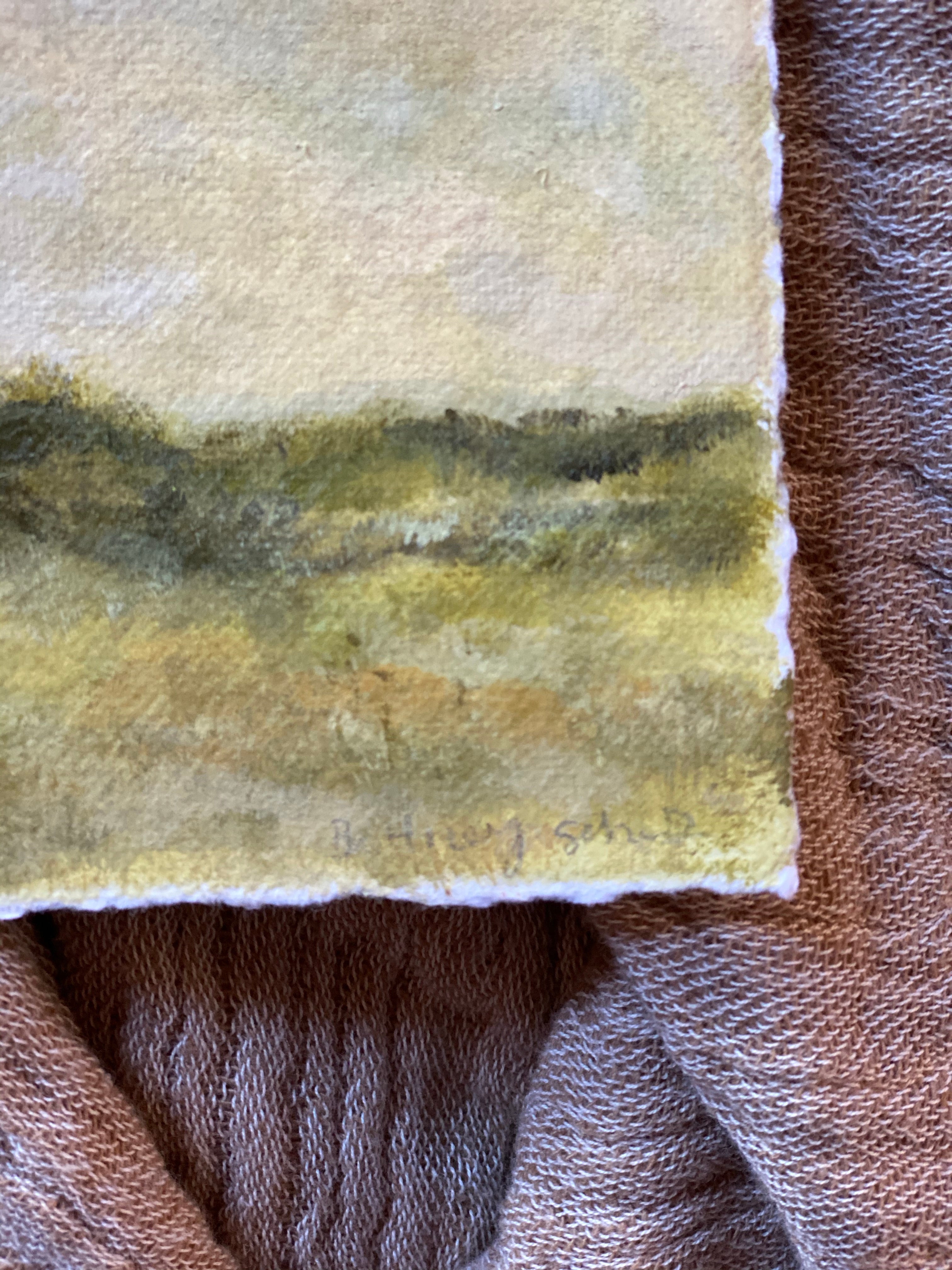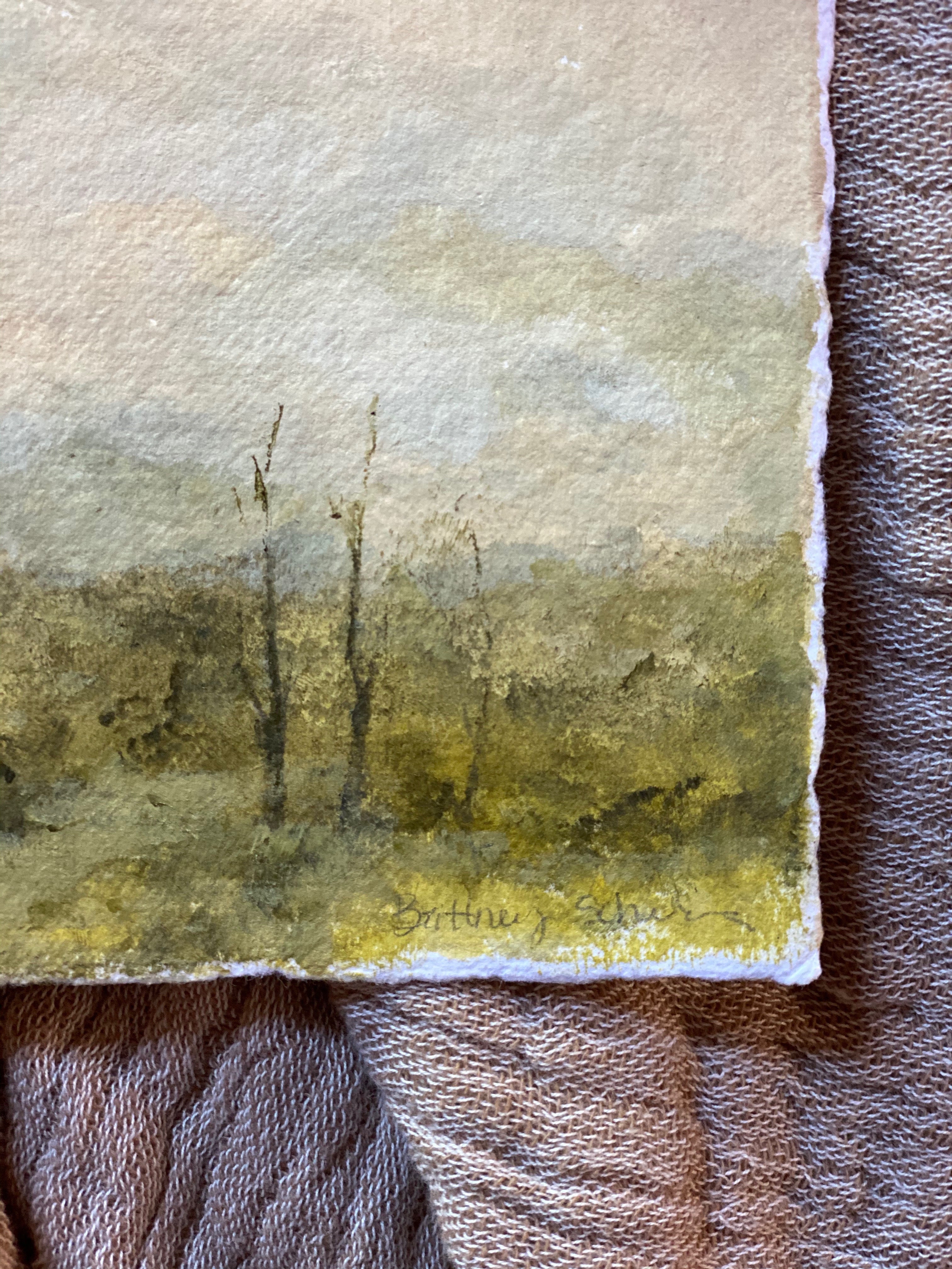 Acrylic original on handmade deckled edge paper. The measurement is as close as possible due to the hand made nature of the deckled edge. Signature on the front corner.