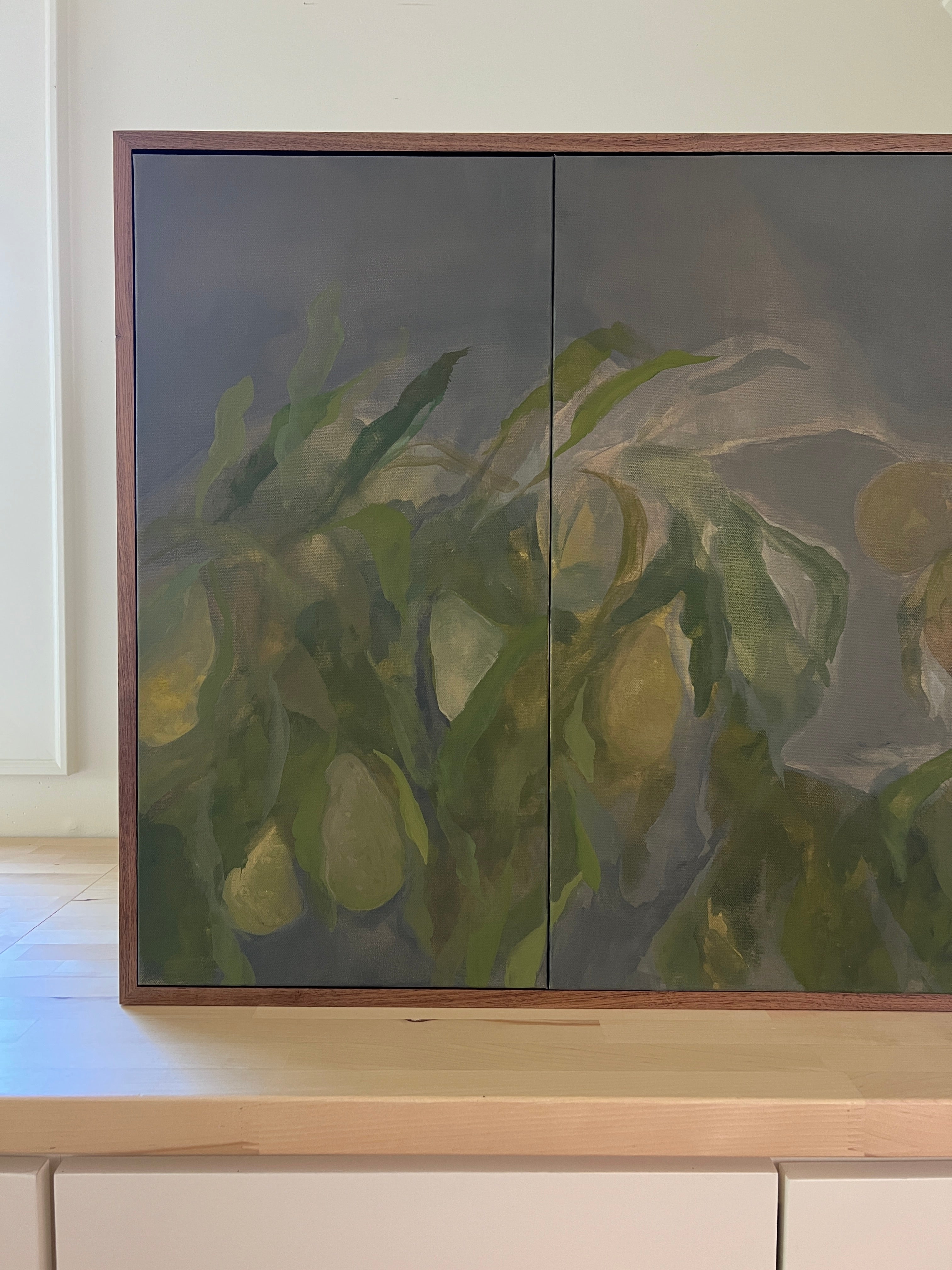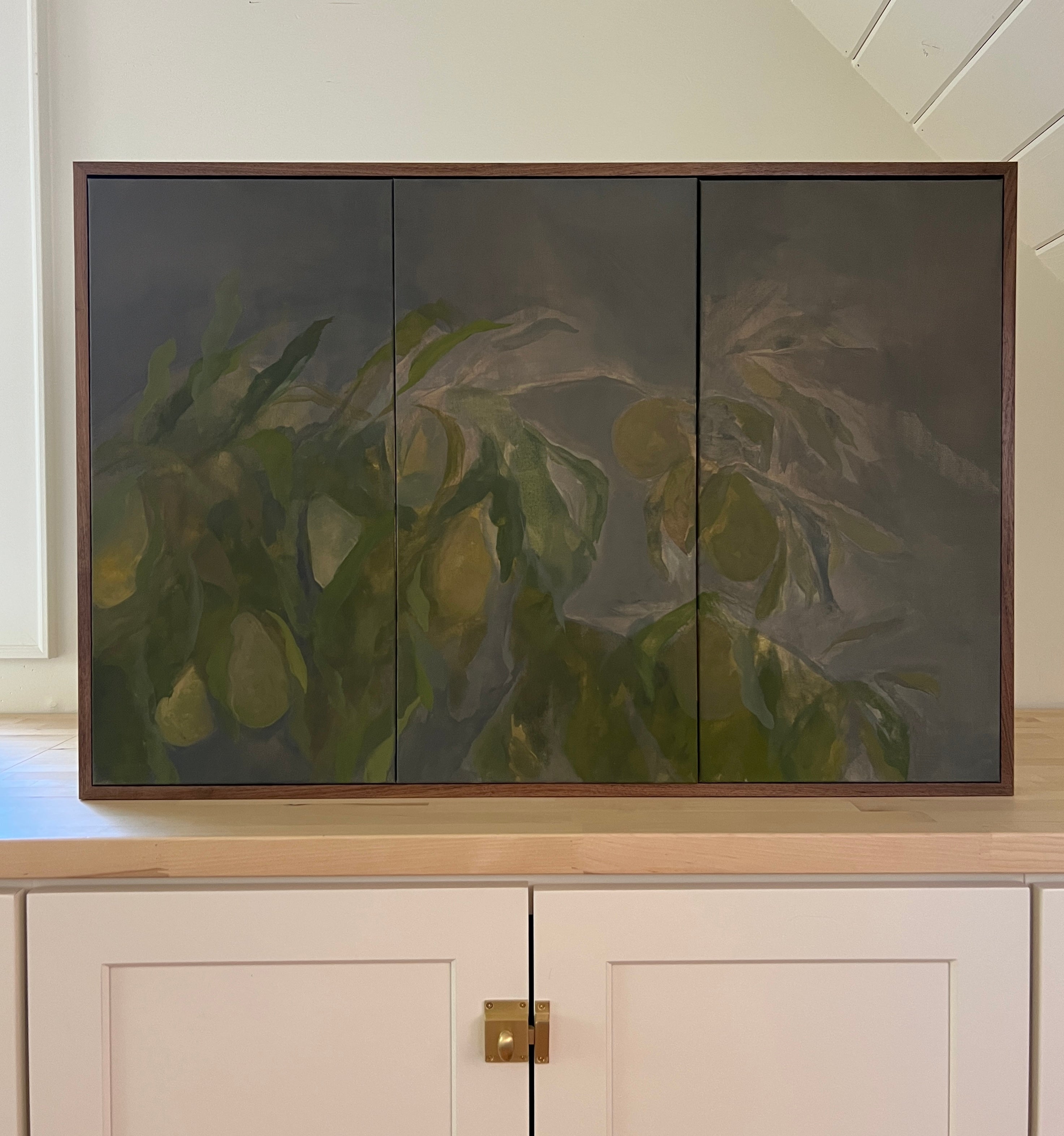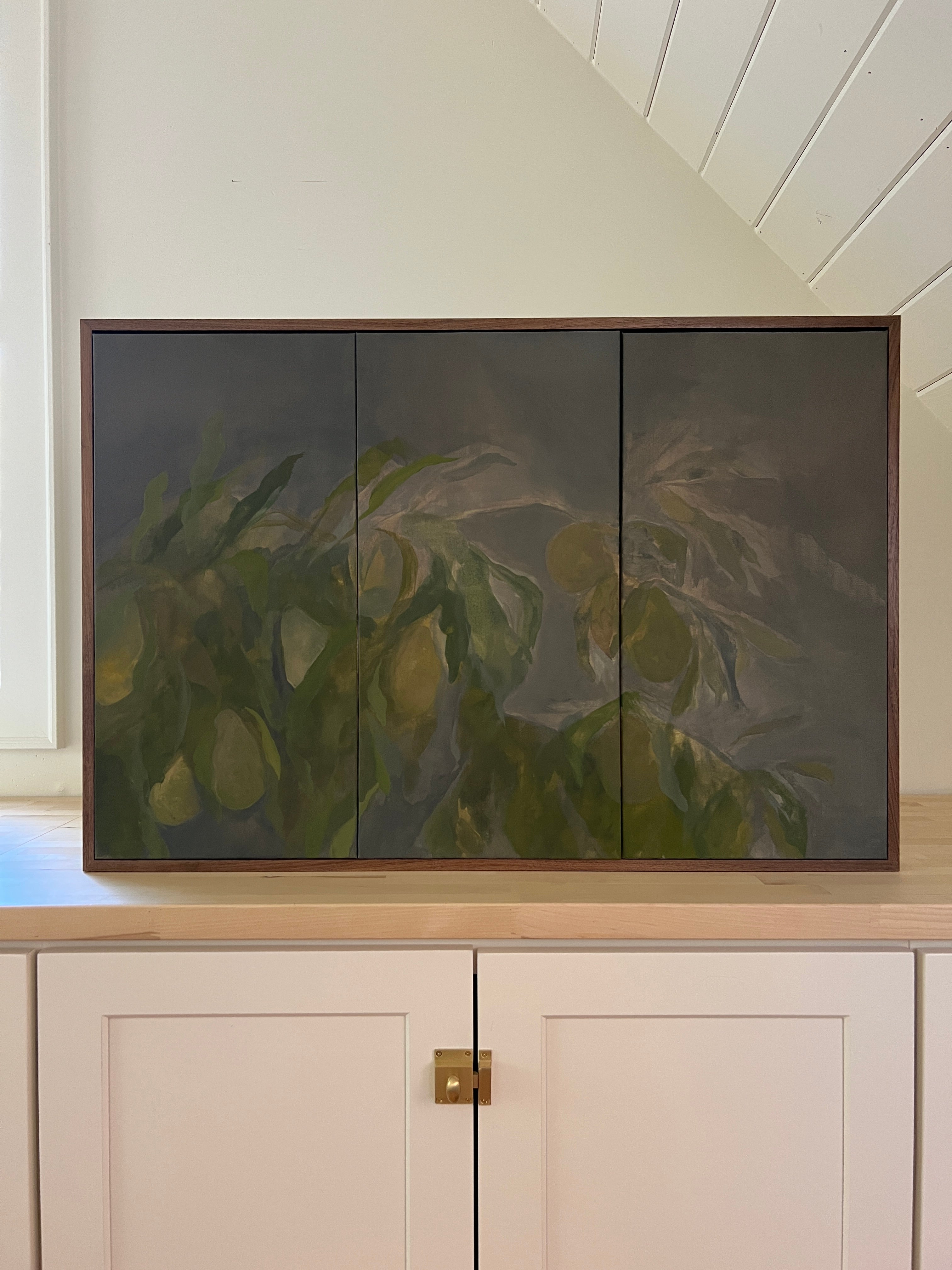 During our visit to a friend's home, I was captivated by their pear tree, its branches heavy with fruit, each pear showcasing a unique shade of ripeness. I decided to create this piece as a triptych to reflect the journey from the abundance to the eventual fading of the pears within their season.