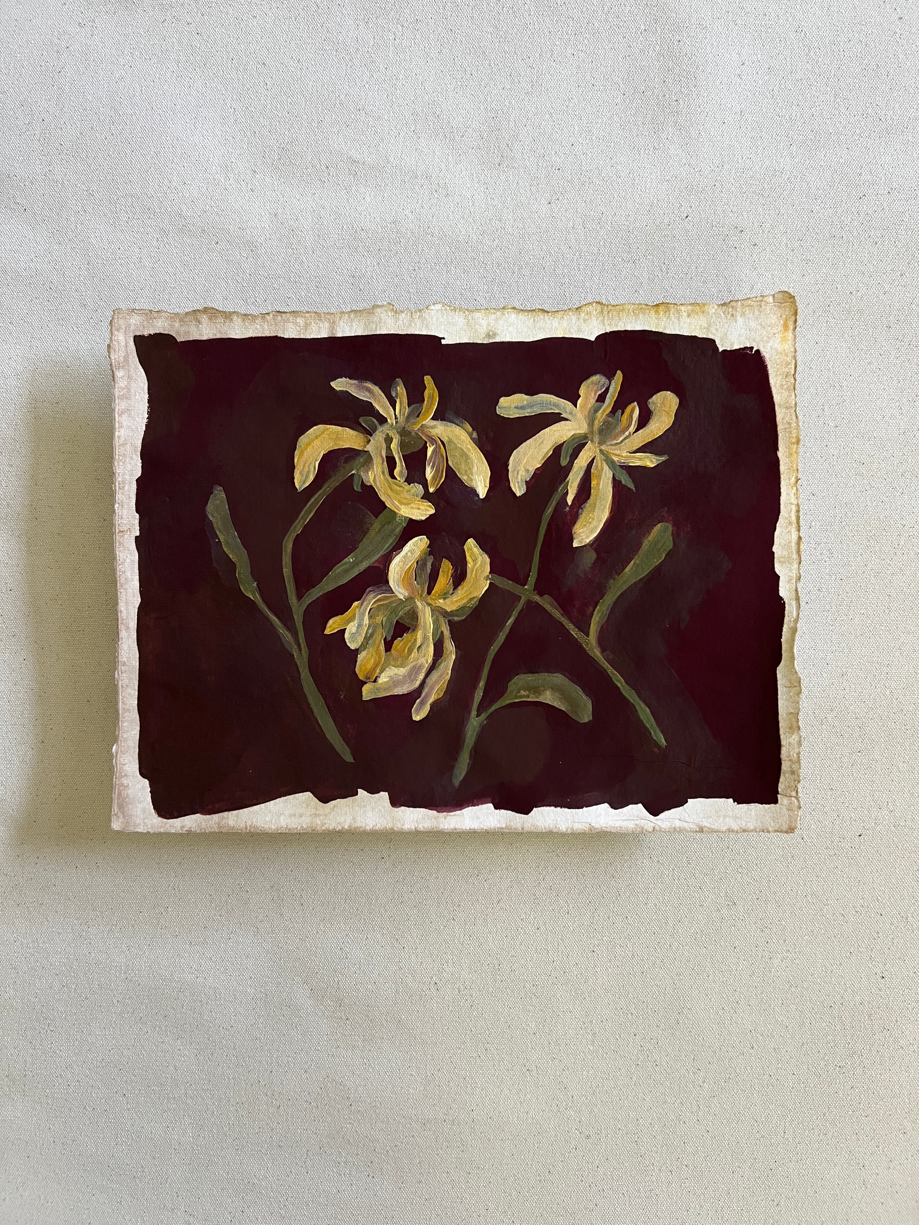 Delicately vibrant originals, created with the idea of capturing each bloom in a dance like state. Full of movement and emotion. Catching the sunflowers as they start to bend. Created on deckled edge paper with thick layers of acrylic paint. Brushstrokes left unblended in order to create depth and movement.